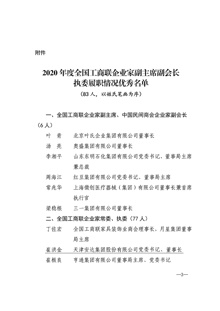 天津安达集团党委书记、董事长崔洪金荣获2020年度全国工商联企业家执委履职情况优秀表彰。
