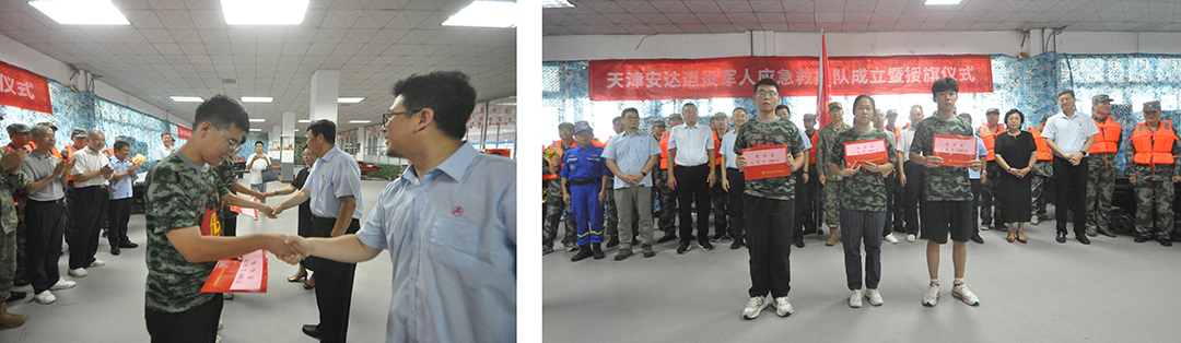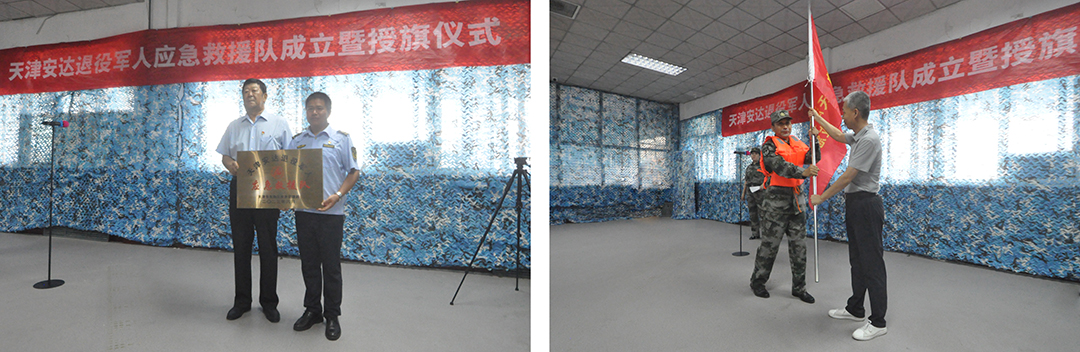 在全体人员的共同见证下,区退役军人事务局局长曹砚海,区应急管理局党委委员俞先军分别向安达集团董事长崔洪金、应急救援队队长张恩欣授牌和授旗。