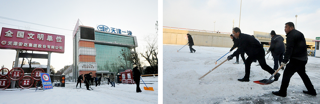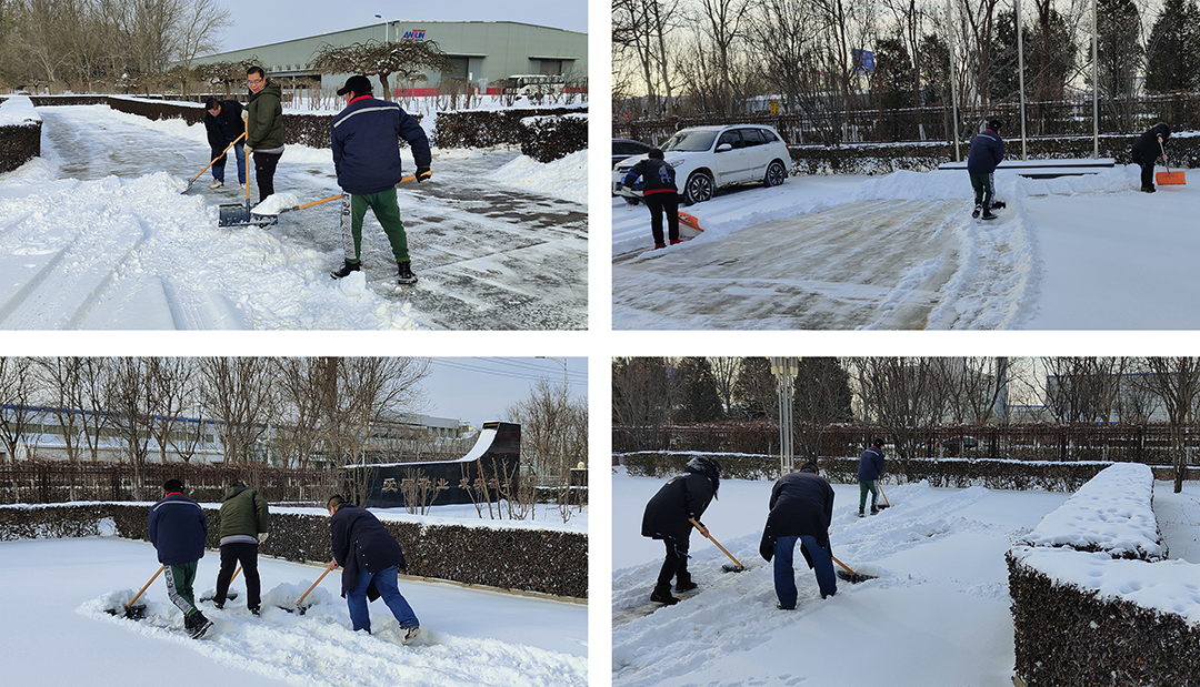 12月14日,降雪覆盖了津城大地。翩然而至的冬雪为城市平添了几分浪漫与诗意,雪景虽美,但也为人们的出行和工作带来诸多不便。为保障员工们安全出行,15日一大早,安达集团本部及各子公司厂院内,各单位员工在相关领导带领下,手拿铁锹、扫帚、簸箕等工具,对办公楼门口和厂区内重要点位进行积雪大清扫。在袭袭寒风中,大家顶风除雪,不畏严寒,“浴”雪奋战,一派热火朝天的景象。
