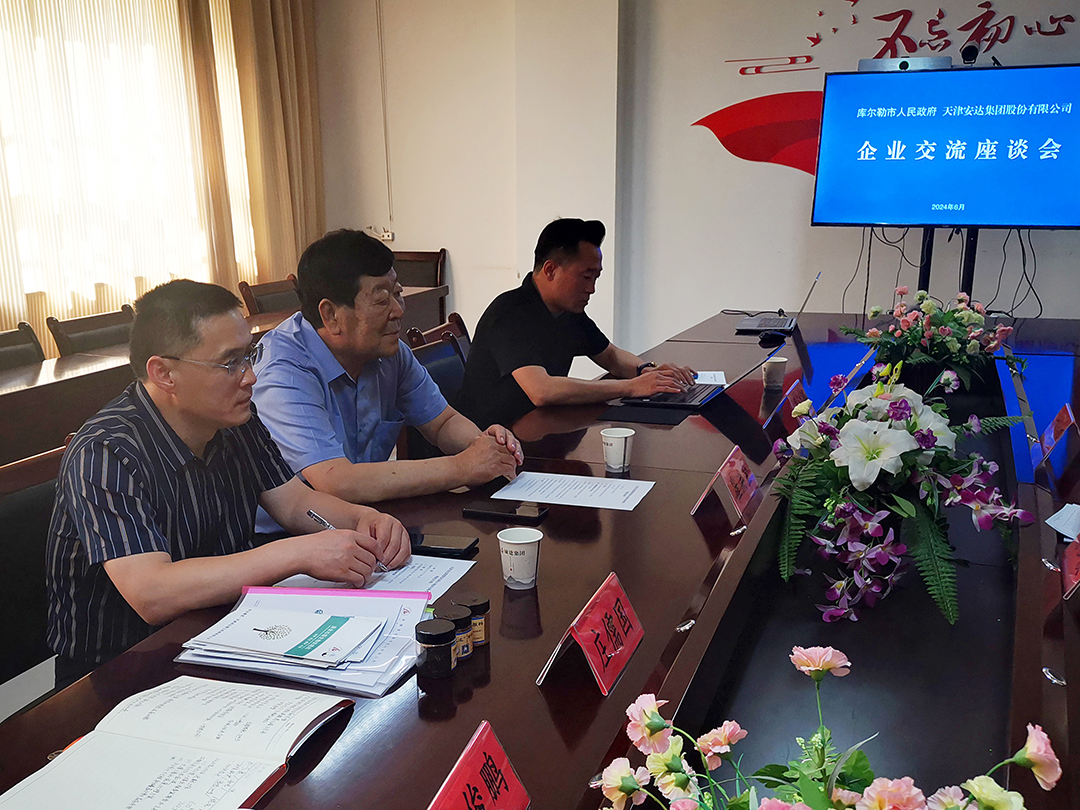 当天下午,库尔勒市政府副市长杨松波、库尔勒市商务和工业信息化局党组书记、副局长王伟,库尔勒市退役军人事务局、市容环卫事务中心、商工局、上库高新产业技术开发区分管领导与安达集团党委书记、董事长崔洪金,安达集团董事长助理王俊鹏,安达集团分公司天津鸿达精工机械有限公司经理庄儒国以及财金城仓(库尔勒)环保科技有限公司副总经理吴江涛共同参加座谈会。